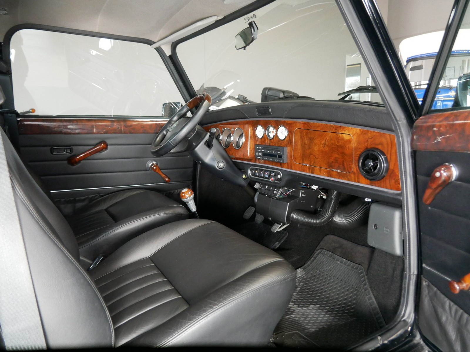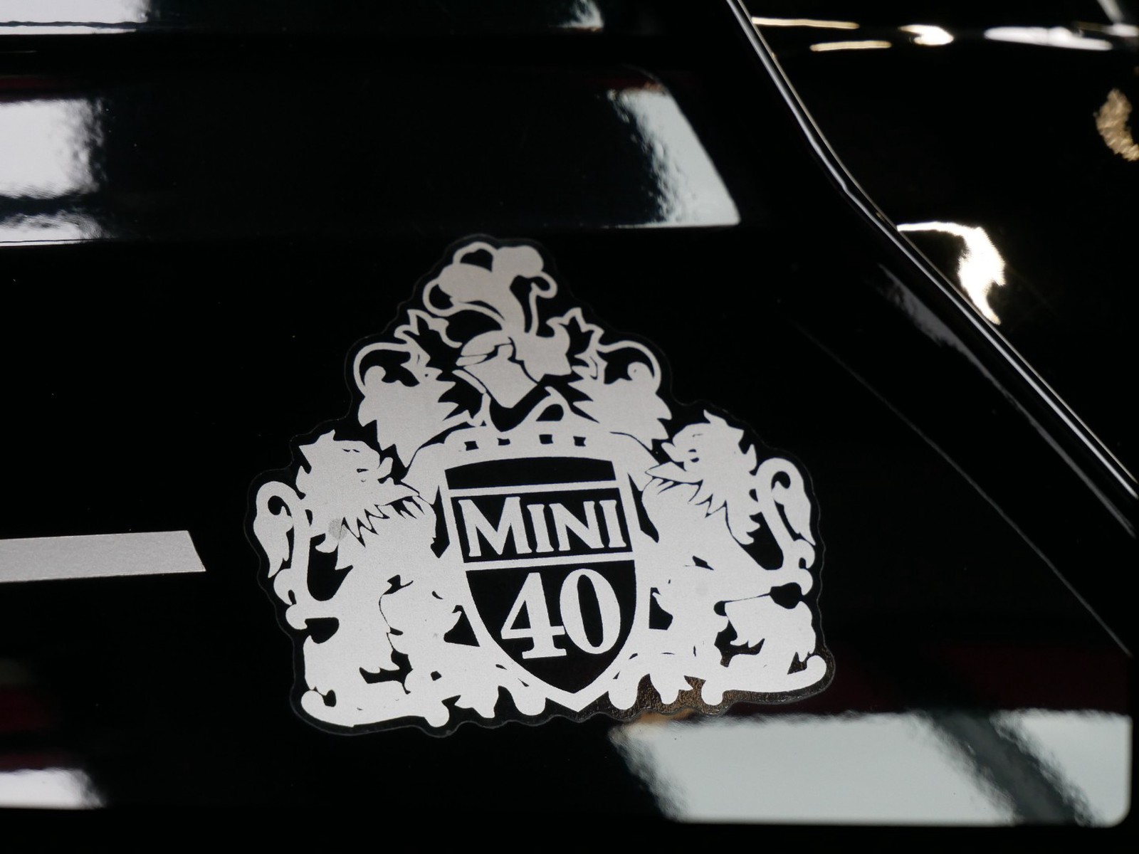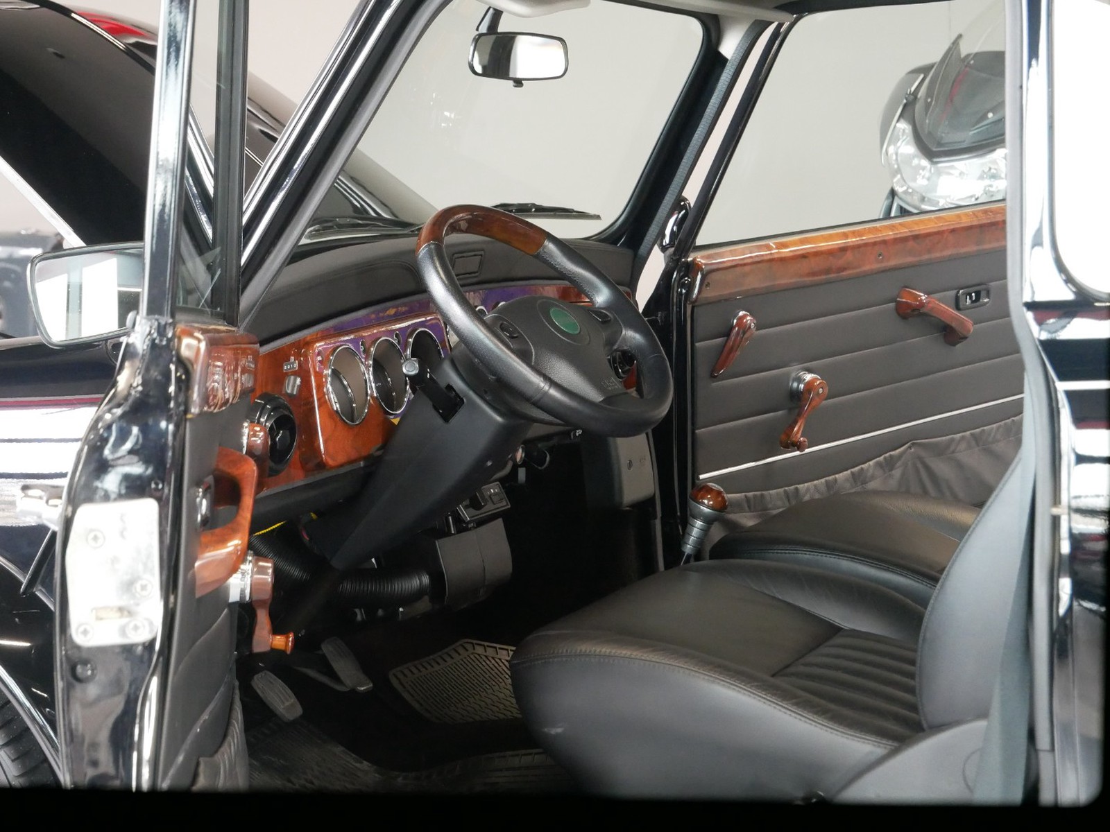 - Hochwertige Innenausstattung: Schwarze Ledersitze kombiniert mit Wurzelholz und spezielle "Mini 40" Embleme verleihen dem Innenraum eine luxuriöse Note.